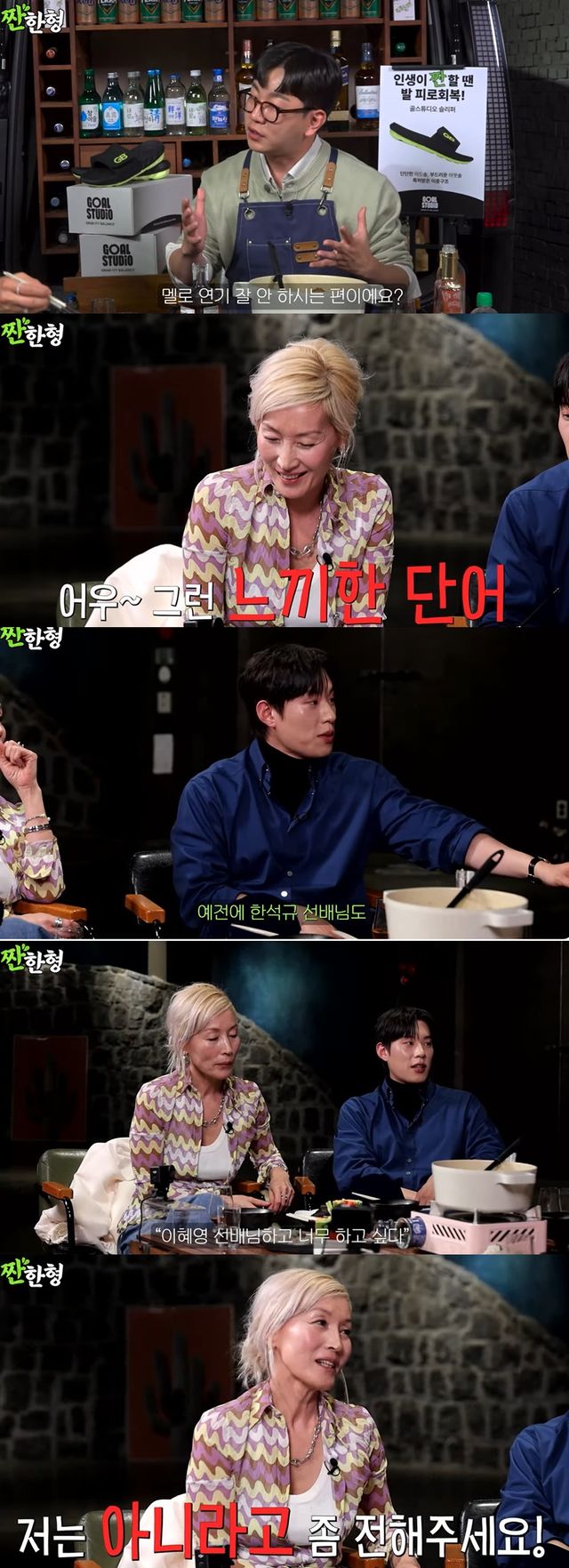 정호철은 "액션 신도 하시고, 엄마 역할도 많이 하신다. 멜로 연기는 잘 안 하시는 편이냐"고 물었고, 이혜영은 "그런 느끼한 단어 쓰지 마라"고 답했다.