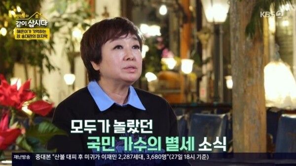 뉴시스 보도에 따르면, 혜은이는 28일 방송된 KBS 2TV 예능프로그램 '박원숙의 같이 삽시다'에 나와 "우리 나이가 되면 그런(부고) 소식을 더 많이 접하게 된다"며 "송대관 선배 돌아가셨을 때 일 때문에 오래 못 있고 빈소 차려지고 바로 다녀왔다"고 말했다.
