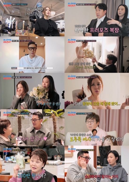 이어 박용근은 미리 준비한 반지를 꺼내 채리나에게 직접 끼워줬다. 그런데 채리나는 "내가 사실 이 반지를 이전에 몰래 봤다. 그런데 (반지를 안 줘서) '내 건가?' 하면서 의심의 밤을 2주 동안이나 지냈다"고 고백해 폭소를 자아냈다. 또 "(지니한테) 형부 가방에 반지가 있는데 내 거 아닌 것 같다고 전화했었다. 내 거였다"며 눈물을 흘렸다.