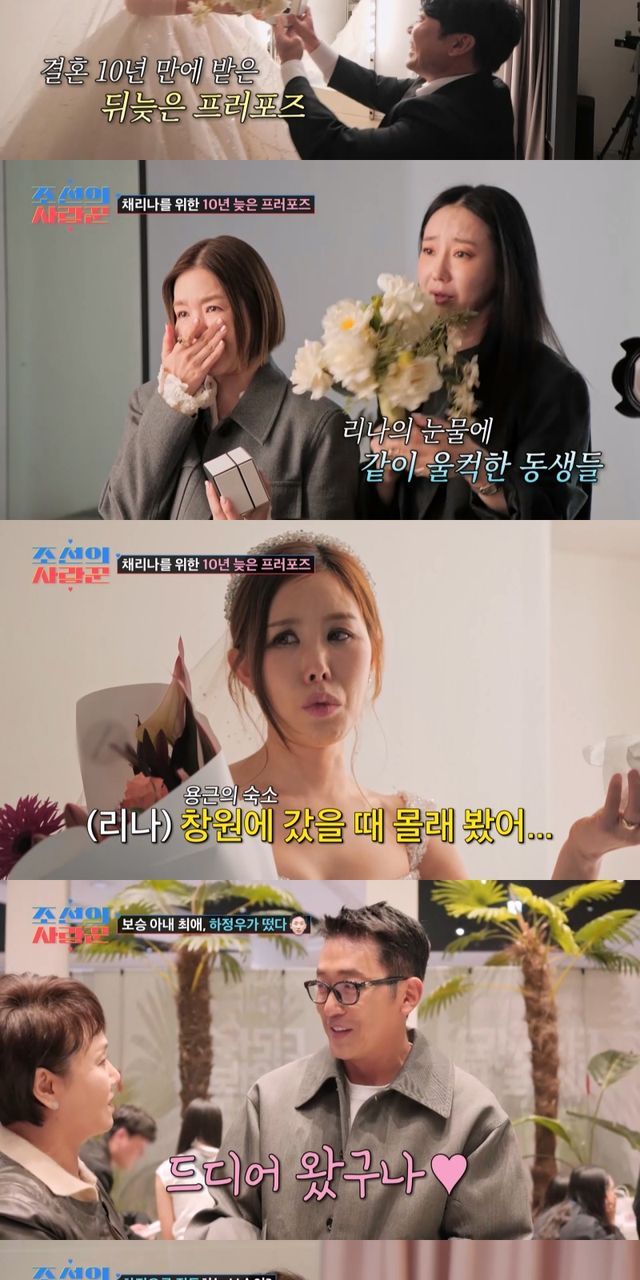 이어 박용근은 미리 준비한 반지를 꺼내 채리나에게 직접 끼워줬다. 그런데 '눈치 100단' 채리나는 "내가 사실 이 반지를 이전에 몰래 봤다. 그런데 (반지를 안 줘서) '내 건가?' 하면서 의심의 밤을 2주 동안이나 보냈다"고 고백해 폭소를 자아냈다. 또 "(지니한테) 형부 가방에 반지가 있는데 내 거 아닌 것 같다고 전화했었다. 그런데 내 거였다"며 눈물을 흘렸다.