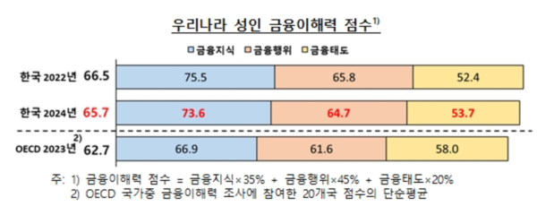 29일 금융감독원과 한국은행이 발표한 '2024 전국민 금융이해력 조사 결과'에 따르면 우리나라 성인의 금융이해력은 65.7점으로 부문별로 금융태도는 지난 2022년 대비 1.3점 상승한 반면 금융지식(73.6점)과 금융행위(64.7점)는 각각 1.9점, 1.1점 하락했다.