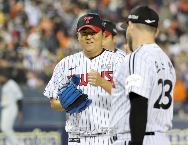 3월 27일 오후 잠실야구장에서 열린 2025 프로야구 한화 와 LG 경기. LG 선발 송승기가 7회 한화 공격을 무실점으로 막아내고 오스틴과 하이파이브하고있다. 잠실=정시종 기자 capa@edaily.co.kr