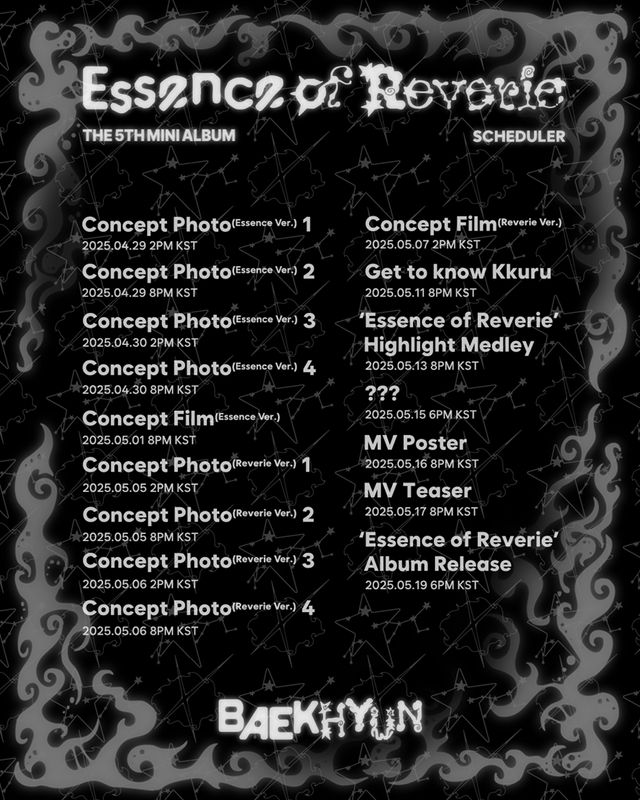 소속사 INB100(아이앤비백)은 지난 28일 공식 SNS를 통해 5월 19일 발매 예정인 백현의 미니 5집 'Essence of Reverie(에센스 오브 레버리)'의 티징 콘텐츠 일정이 담긴 스케줄러를 공개했다.