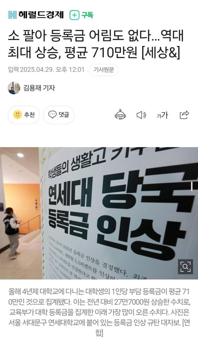 4년제 대학생 1인당 평균 등록금: 710만6500원