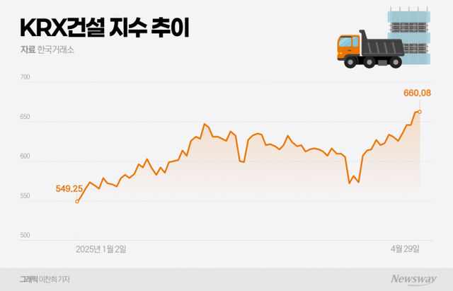29일 한국거래소에 따르면 KRX건설 지수는 이날 전 거래일 대비 1.34(0.20%)포인트 오른 659.98로 장을 마치며 지난 23일 이후 5거래일 연속 상승세를 기록했다. 이는 올해 초(549.25) 대비 20% 상승한 수치다.