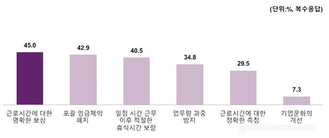 올해 1월에 한국콘텐츠진흥원이 발간한 2024 게임산업 종사자 노동환경 실태조사에 따르면 응답자 중 58.7%가 주 52시간 근무제 유연화에 찬성한다고 답했다. 아울러 유연화에 대한 전제조건으로 ‘근로시간에 대한 명확한 보상(45%)’, ‘포괄임금제 폐지(42.9%)’, ‘일정 시간 근무 후 적절한 휴식시간 보장(40.5%)’을 꼽았다.