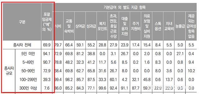 아울러 앞서 이야기한 재량근로제나 탄력근로제 단위기간 증가로 인해 발생할 수 있는 ‘공짜야근’을 막기 위해서는 포괄임금제를 폐지할 필요가 있다. 이에 대해 조영기 협회장은 “최근 몇 년 사이에 노동조합이 설립된 회사들이 있는데, 노동조합이 있는 회사는 포괄에서 비포괄로 많이 전환했다. 노동조합이 없더라도 제가 알기로는 비포괄로 많이 전환하는 것으로 알고 있다”라고 밝혔다. 다만 앞서 이야기한 노동환경 실태조사에 따르면 전체 응답자 중 69.6%가 포괄임금제로 임금을 받았고, 5인 미만과 5~49인 이하에서는 그 비중이 90% 이상이다.