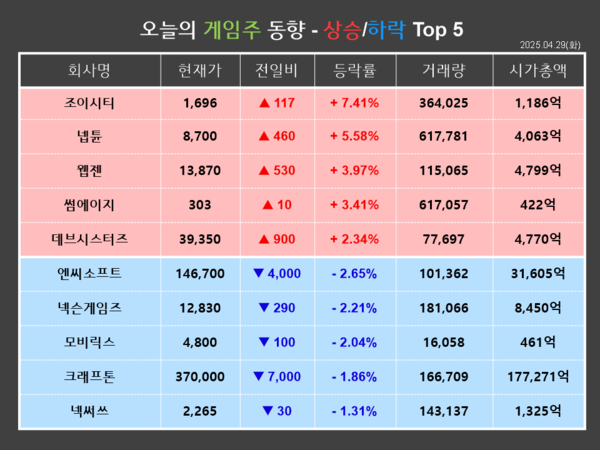 반면, 엔씨소프트는 금일(29일) 전거래일 대비 2.65%(4,000원) 하락한 146,700원에 장을 마감했다. 개인과 기관이 각각 20,407주, 4,725주를 순매수한 반면, 외국인이 25,297주를 순매도하며 장 초반부터 하락해 약세로 마쳤다.