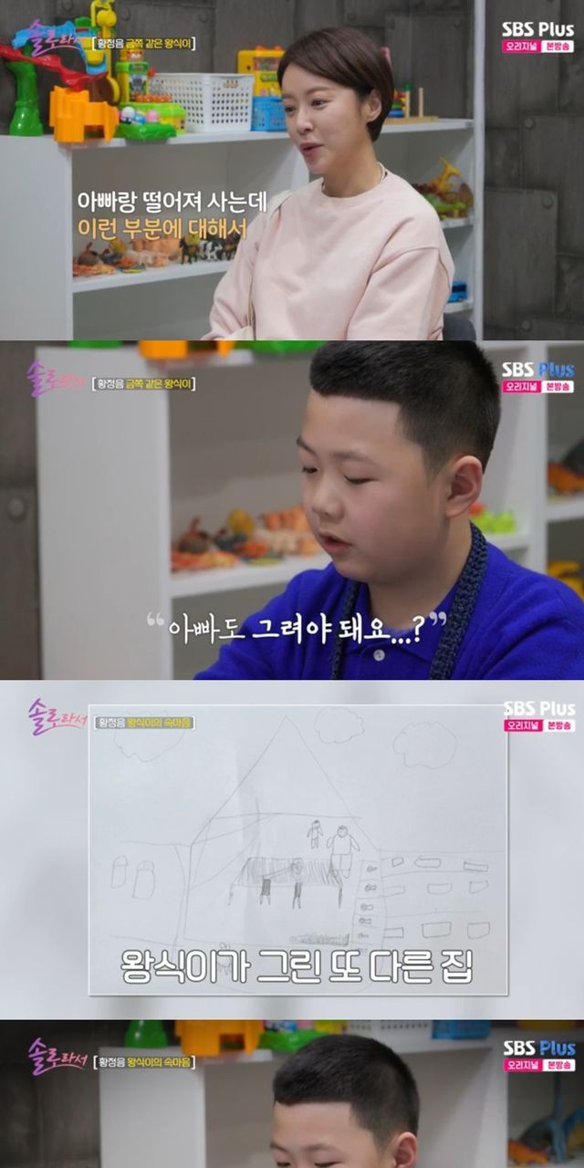 상담가는 "왕식이는 아빠와 함께하는 집을 생각하고 함께하기를 바라는 마음도 드러난 거다"라고 이야기하며 "현실을 부정하는 거냐"는 황정음의 질문에 "현실을 너무 잘 알아서 내 집이라고 이야기 안한 거다"라고 답했다.