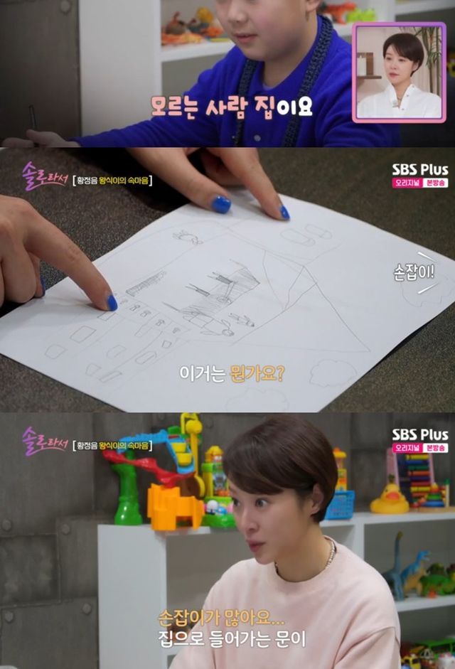 황정음은 왕식이의 그림을 보고 "아빠랑 왕식이 같다"고 바로 알아챘고, 상담가는 "그렇게 애가 표현도 못했다"고 짚었다.