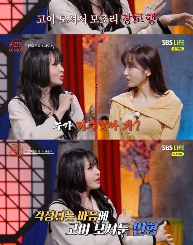 서유리는 "저도 '저주받았구나' 생각을 했던 게 굿즈를 만들었다. 제 모습을 딴 인형을 100개로 만들었다. 팬클럽 친구들에게 선물을 주거나, 일부는 판매하려고 만들었는데 고이 모셔서 창고에 넣어놨다"고 말했다.