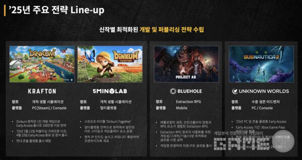크래프톤은 2025년 사업계획도 밝혔다. 아티스트 및 브랜드와 협업, 신규 맵∙모드 적용 등 콘텐츠를 고도화해 사용자 경험을 강화하고, ‘배틀그라운드’ IP 기반 신작으로 새로운 세대와 전 세계 시장을 아우르는 플랫폼과 장르의 확장을 가속화한다는 것이다. 구체적으로 익스트랙션 슈팅 장르인 ‘프로젝트 블랙버짓’, 배틀로얄 콘솔 게임 ‘프로젝트 발러’, 탑다운 전술 슈팅 신작 ‘PUBG: 블라인드스팟’을 꼽았다. 또한 언리얼 엔진 5를 통해 실사 그래픽으로 전환과 UGC 도입으로 신선한 이용 경험을 제공하고 나아가 ‘배틀그라운드’를 ‘PUBG 2.0’ 게임플레이 플랫폼으로 도약시킬 예정이다.