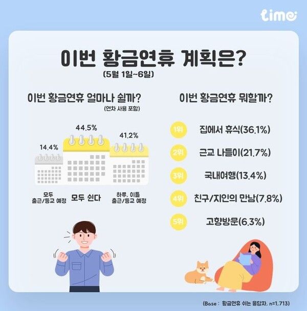 조사 결과 5월 1~6일 '모두 쉰다'는 응답이 44.5%로 가장 많았고, 하루·이틀 출근 예정(41.2%), 모두 출근·등교 예정(14.4%) 순으로 나타났다.