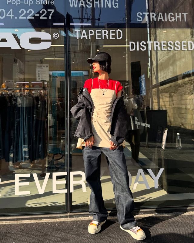 빳빳한 질감과 어두운 컬러가 특징인 생지 데님도 와이드한 실루엣을 선택한다면 색다른 룩을 즐길 수 있다. 다양한 스타일을 자유롭게 즐기는 나나는 선명한 레드 컬러 반팔 티에 미니 원피스를 겹쳐 입은 후 와이드 청바지와 운동화로 캐주얼한 분위기를 연출했다. 살짝 걸친 듯한 청자켓까지 완벽하다.