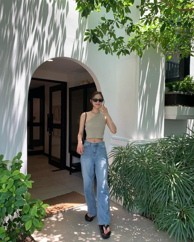 뜨거운 햇살이 내리쬐는 여름의 분위기와도 잘 어울리는 와이드한 실루엣의 청바지는 장희령처럼 시원한 느낌이 드는 원 숄더 톱과 매치해도 근사하다. 청량함 그 자체인 밝은 컬러의 청바지에 크롭트 원 숄더 톱을 매치한 후 블랙 선글라스와 샌들로 휴양지에서도 완벽하게 어울릴 룩을 선보였다.