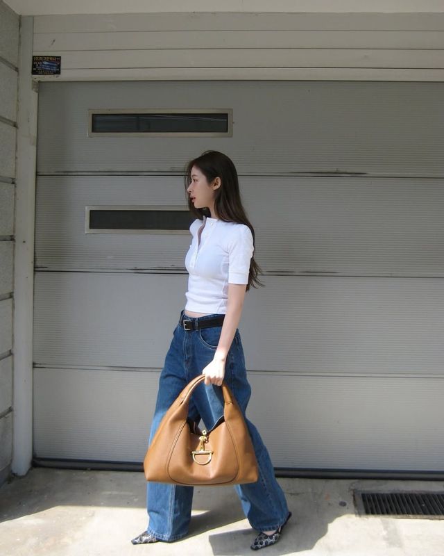 와이드 데님 팬츠를 즐기는 가장 쉽고 간편하면서도 모던한 방법을 제안한 차정원. 군더더기 없이 간결한 화이트 컬러의 버튼 티셔츠에 짙은 블루 컬러의 청바지를 매치하고 클래식한 벨트와 빅 백으로 포인트를 줬다. 이 간단한 조합만으로 트렌디한 데일리 룩을 완성할 수 있으니 눈여겨보길.