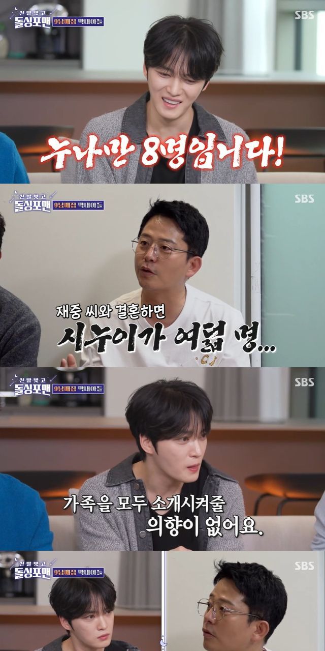 김재중은 "정말 결혼식장 들어가기 직전까지 가족을 모두 소개해 줄 의향이 없다. 누나들도, 친척들도 결혼식장에서 처음 봐야지 (아니면) 리스크가 너무 크다. 안 보여줄 거다"고 단호하게 답했다.