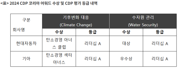 한편, 현대차와 기아는 지난 17일 먼저 공개된 2024 CDP 평가 결과에서 기후변화 대응과 수자원 관리 부문 모두 최고 등급인 리더십 A를 획득한 바 있다.