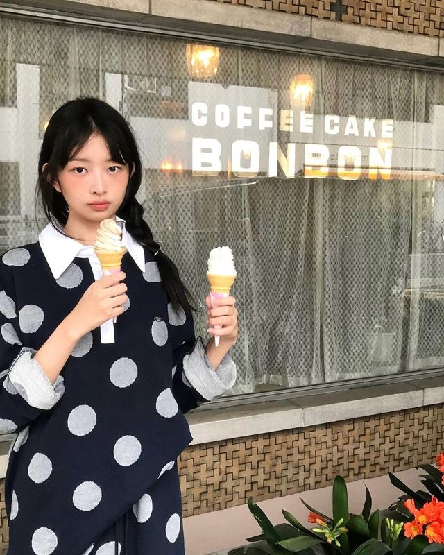 레이의 이번 스타일링에서 주목할 점은 도트 패턴을 활용한 레트로 무드의 연출이다. 도트는 최근 시즌마다 리바이벌되는 패턴 중 하나로, 사랑스러운 분위기를 연출하고 싶은 이들에게 꾸준히 사랑받는 트렌드다. 레이는 도트 특유의 발랄함을 과하지 않게 살리면서, 아이스크림과 함께한 자연스러운 연출로 소녀 감성을 극대화했다. 네티즌들 사이에서는 “동화 속 주인공 같다”, “아이스크림보다 레이가 더 달콤해 보인다”는 반응이 이어지며 폭발적인 인기를 입증했다.