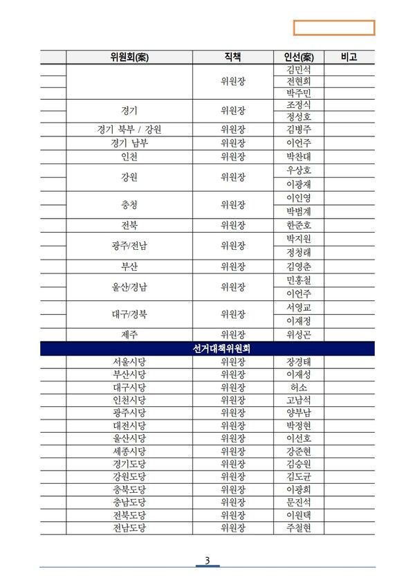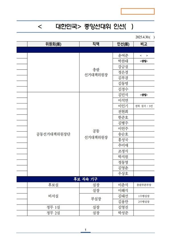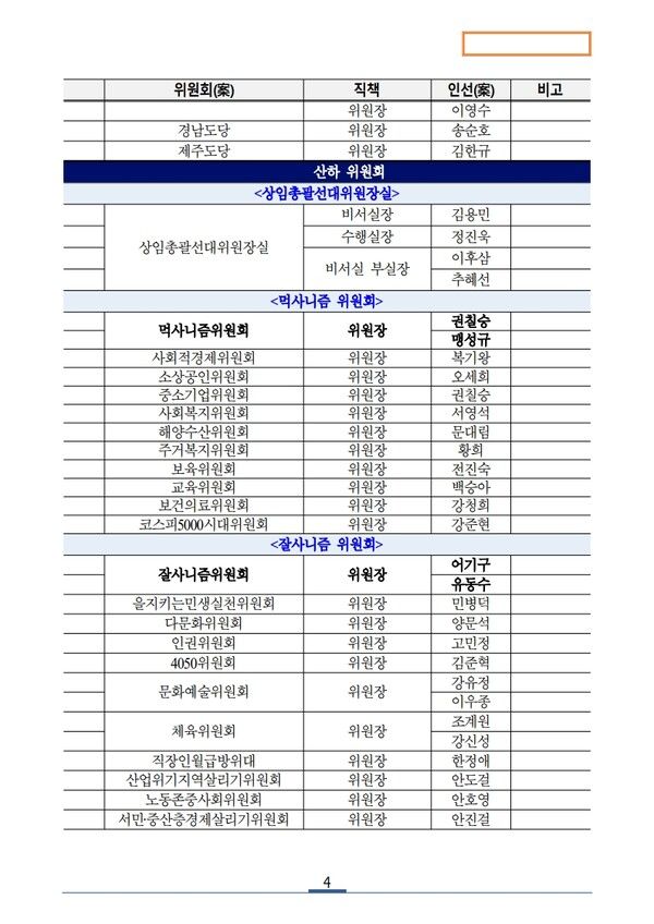 이날 민주당은 ▲국민 통합 ▲민심 경청 ▲지역 현장 ▲당원 중심 정당이라는 기조에 맞춰서 선대위 인선을 짰다고 발표했다.