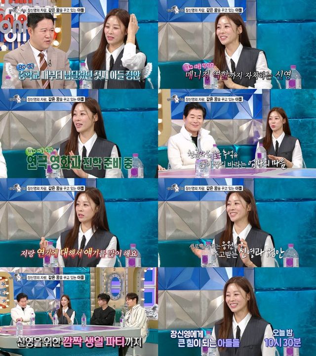 그런가 하면 장신영은 학업 때문에 현재 떨어져 살고 있는 첫째 아들과 문자나 전화를 자주 하는데, 서로 힘이 되는 응원을 주고받는다고 전한다. 자신의 생일날에는 아들이 케이크를 들고 찾아와, 깜짝 생일 파티를 해줘 감동을 받았던 사연을 전해 모두의 부러움을 자아낸다.
