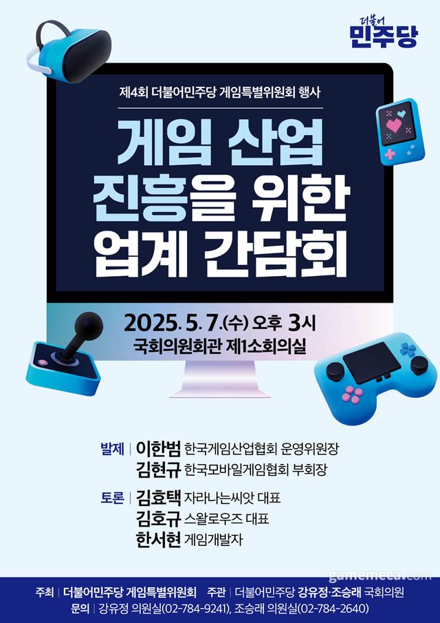 더불어민주당 게임특별위원회(이하 게임특위)는 오는 5월 7일 오후 3시에 국회의원회관 제1소회의실에서 게임산업 진흥을 위한 업계 간담회를 개최한다.
