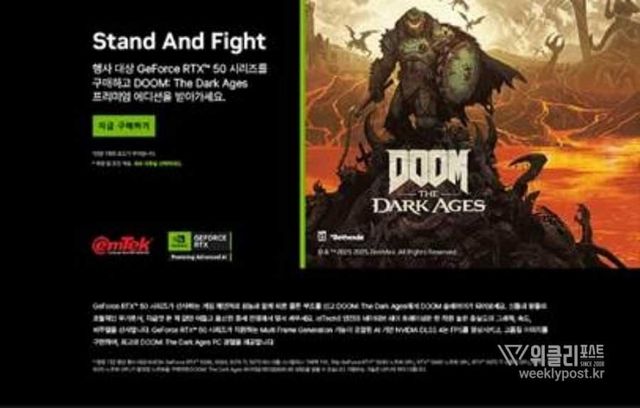 이엠텍아이엔씨가 4월 30일부터 5월 21일까지 지포스 RTX 5070 이상 그래픽카드 또는 해당 그래픽카드가 장착된 PC를 구매한 고객을 대상으로 1인칭 슈팅 게임 ‘둠: 더 다크 에이지스(DOOM: THE DARK AGES)’ 게임 번들을 증정하는 프로모션을 진행한다.