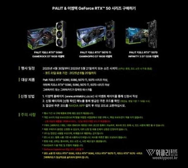 프로모션은 이엠텍 공식 홈페이지를 통해 제품 구매 후 프로모션 코드를 신청한 고객에게 게임 코드를 제공하는 방식으로 진행되며, 프로모션 대상 제품은 Palit 지포스 RTX™ 5070 시리즈 이상 전 제품이다.