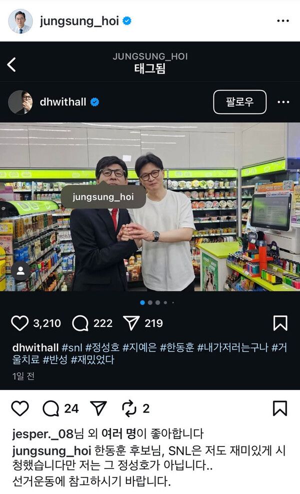 그런데 한 후보는 이 게시물의 인물 태그를 하는 과정에서 개그맨 정성호가 아닌 '친명(親이재명계) 좌장' 정성호 민주당 의원을 잘못 붙이는 실수를 저질렀다. 이름을 검색하면 상단에 뜨는 이용자들 중 정 의원을 동명이인 개그맨이라고 착각한 것으로 보인다.