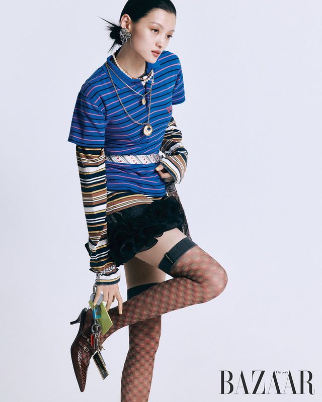 피케셔츠, 팔찌로 연출한 키링은 Balenciaga. 이너 톱은 We11done. 러플 스커트는 44만원 Ych. 귀고리는 Self-Portrait. 진주 목걸이는 Miu Miu. 멀티 비즈 목걸이, 슬링백 슈즈는 Celine by Hedi Slimane. 레이어드한 크로스 펜던트 목걸이, 골드 펜던트 목걸이는 Dolce & Gabbana. 롱 펜던트 목걸이는 Chloé. 허리에 두른 타이는 Vivienne Westwood. 반지는 Hermès. 니삭스는 13만9천원 Romantic Tiger.