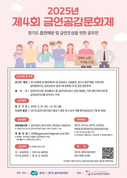 올해로 4회를 맞은 금연 공감 문화제는 세계금연의 날(5월 31일)을 기념해 경기도민의 흡연예방과 금연문화 조성을 위한 작품을 창작하고 함께 금연하는 분위기를 조성하는 데 목적이 있다.