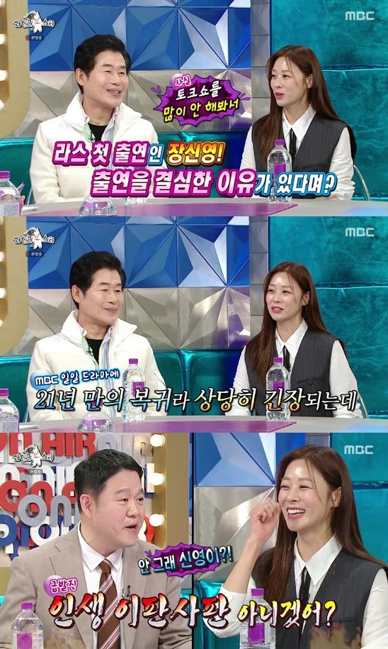 장신영은 '라디오스타' 첫 출연 소감으로 "토크쇼는 많이 안 해봐서 어색하다"라며 "그런데 ('동상이몽' 출연한) 구라 선배님도 계시고, 이연복 셰프님도 계신다고 해서 편하겠다 싶었다"라고 이야기했다.