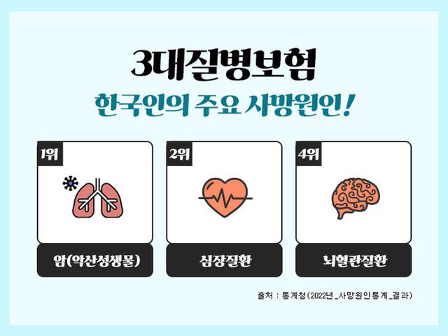 [와이뉴스] 흔히 3대질병이라 일컫는 암, 심혈관질환, 뇌혈관질환은 통계청 발표자료에 따르면 한국인의 주요 사망원인 중에서 3위 폐렴을 제외하고 1~4위를 차지하고 있으며, 이전부터 지금까지도 살면서 가장 먼저 대비해야 하는 치명적인 질병으로 강조되고 있다. 이러한 중대질병에 대비하기 위하여 상기 세가지 치명적인 질병을 집중보장하는 3대질병진단비보험을 많이 가입하고 있다. 3대진단비보험은 각각의 질병을 중점적으로 보장하면서도 가입자 특성에 맞는 특약을 추가함으로써 종합건강보험으로도 활용할 수가 있다.