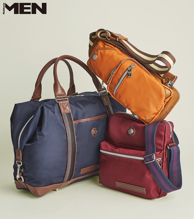 다크 네이비 나일론 콤플리카타 토트백과 오렌지 자코미오 슬링백, 버건디 포켓 숄더백 모두 Orobianco by Fourm Lounge.