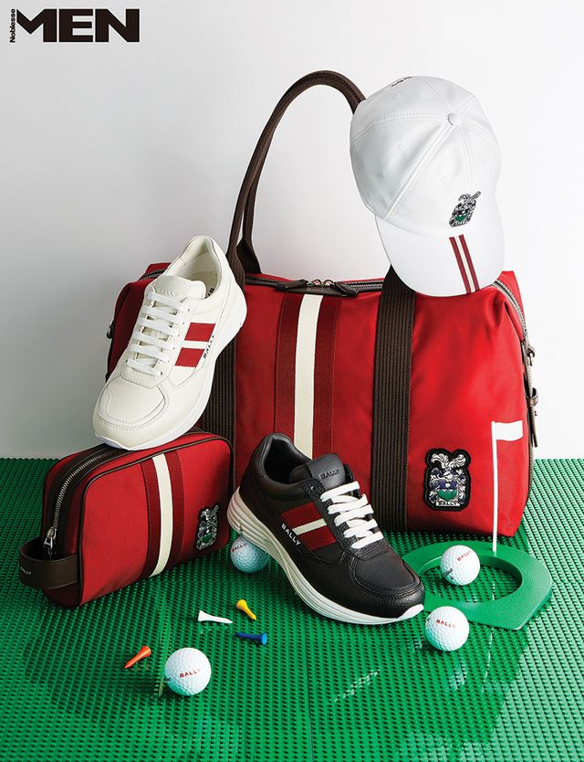 화이트 크레스트 로고 볼캡과 크레스트 패치가 돋보이는 나일론 더플백, 블랙 소가죽 그레인 골프화, 워시 클러치백, 화이트 소가죽 그레인 골프화 모두 Bally.