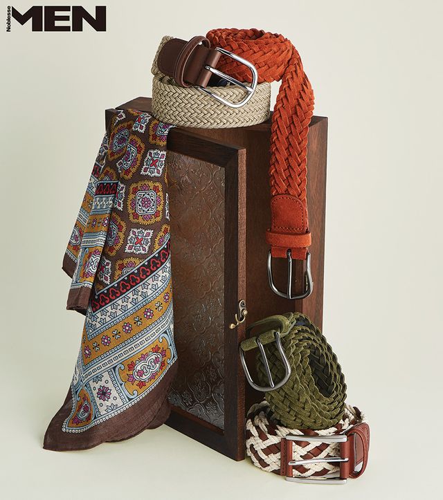 오렌지 스웨이드 벨트와 아이보리 레더 우븐 벨트, 카키 소가죽 벨트, 컬러 배색 벨트 모두 Anderson’s by Fourm Lounge, 에스닉한 패턴이 이국적인 포켓 스퀘어 Drake’s by Fourm Lounge.