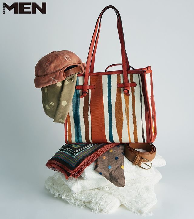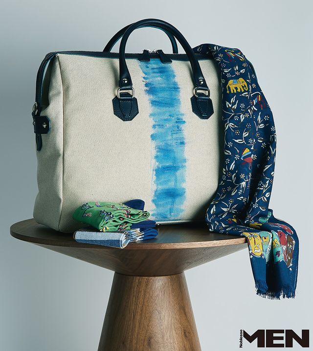 페인트 장식이 돋보이는 코튼 캔버스 더플백 Bonfanti by Fourm Lounge, 그린 바이크 그래픽 양말과 멀티컬러 스트라이프 양말 모두 Marcoliani by Fourm Lounge, 버드 오브 파라다이스 스카프 Drake’s by Fourm Lounge.