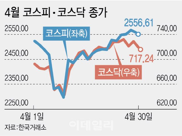 1일 엠피닥터에 따르면 지난 4월 코스피는 3.04% 오른 2556.61로 마쳤다. 코스닥은 6.60% 상승했다. 트럼프발 관세가 시장에 악영향을 미치면서 3월 말부터 본격적으로 증시가 롤러코스터를 타기 시작했다. 2500선이었던 코스피는 지난달 9일 2200선까지 내려앉았다가 관세 완화 기대감에 ‘V’자 반등을 하는 등 변동성이 확대했다.