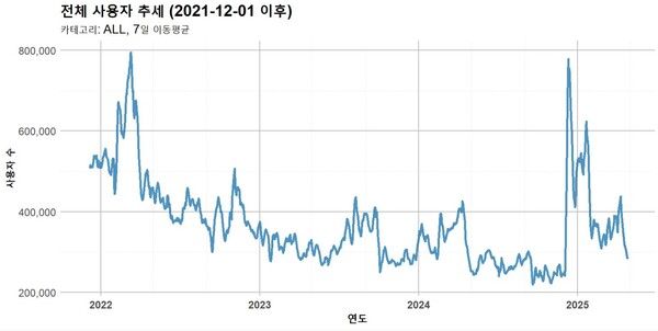 시기적으로 댓글 사용자는 2022년 3월 9일 대통령 선거 전에 80만명까지 늘어났다가 점진적으로 줄어들었다. 2023년부터 2024년 중반까지는 20만 명에서 40만 명 수준으로 감소했다. 2024년 말 20만 명 수준이던 사용자는 12월 3일 계엄 이후 80만 명으로 급격히 반등했다가 올해 초 다시 안정화됐다.