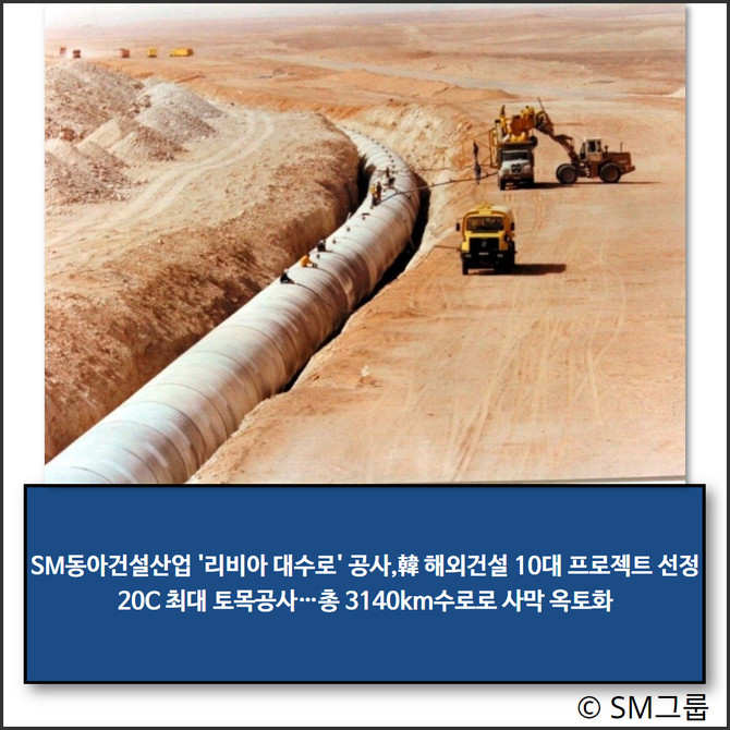 SM그룹의 건설부문 계열사 동아건설산업은 국토교통부와 해외건설협회가 해외건설1조 달러 수주 및 60주년을 기념해 실시한 '대한민국을 빛낸 해외건설 10대 프로젝트' 조사에서 리비아 대수로 공사가10대 프로젝트 중 하나로 선정됐다.