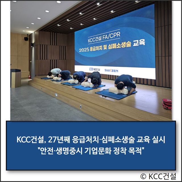 KCC건설은 지난달 28일부터 177명의 임직원이 참여하는 '2025년 응급처치를 비롯한 응급상황시 행동요령에 대한 교육'에 나섰다. 오는 6월까지 총 3회차에 걸쳐 진행되며, 각 차수별로 2개 반을 운영한다.