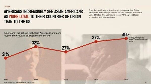 아시아계 미국인이 미국보다 출신 국가에 더 충성심을 가지고 있다고 믿는 비아시아계 응답자의 비율은 2021년 이후 두 배로 증가했다.