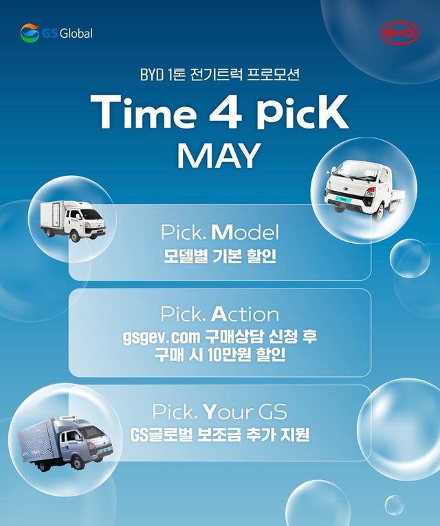 [엠투데이 이세민 기자] GS글로벌이 5월 한 달간 BYD 1톤 전기트럭 T4K 구매 고객을 대상으로 파격적인 구매 혜택을 제공하는 특별 프로모션을 진행한다고 2일 밝혔다.