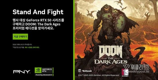 STCOM이 4월 30일부터 5월 21일까지 PNY 지포스 RTX 5070 시리즈 이상 그래픽카드 구매 고객을 대상으로 FPS 신작 ‘DOOM: The Dark Ages’ 게임 코드를 증정하는 번들 프로모션을 진행한다.