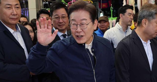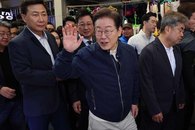 '골목골목 경청투어 : 접경벨트편'에 나선 이재명 더불어민주당 대통령 후보가 2일 오전 강원 철원군 동송전통시장을 찾아 상인들과 인사를 하고 있다. / 뉴스1(공동취재)