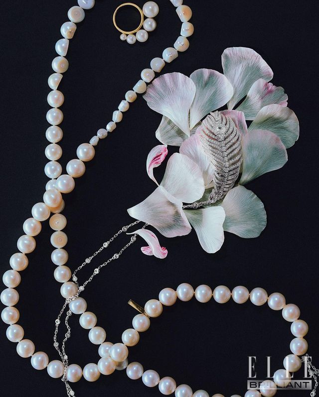 (왼쪽부터) 18K 옐로 골드 소재에 아코야 진주와 반으로 커팅한진주슬라이스를 이어 완성한 ‘슬라이스드’ 네크리스, 다양한 사이즈의 진주를 장식한‘쉘’링은모두가격미정 TASAKI. 깃털을 모티프로 1개의 로즈 컷 다이아몬드와 563개의 라운드 컷 다이아몬드를 세팅한 ‘플륌드 펑’ 네크리스는 9천만원대 BOUCHERON.