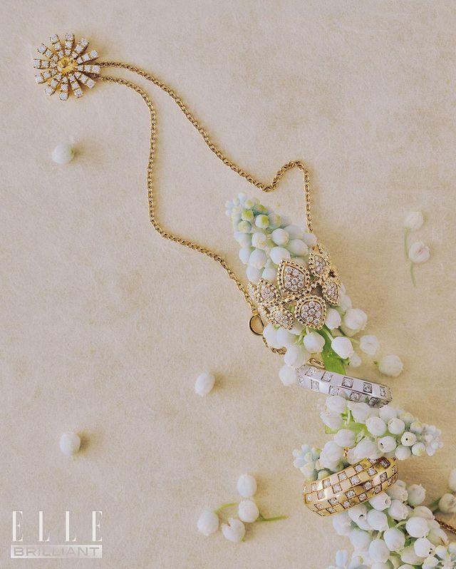 (위부터) 총 4.85캐럿의 다이아몬드를 세팅한 ‘와일드 플라워 컬렉션 파베 다이아몬드’ 롱 네크리스는 가격 미정 GRAFF. 18K 화이트 골드와 다이아몬드로 이루어진 ‘까멜리아’ 링은가격미정 CHANELFINE JEWELRY. 5.79캐럿 에메랄드 26개와 1.13캐럿의페어셰이프 다이아몬드 18개, 0.79 캐럿 다이아몬드 186개를 세팅한 ‘하이 주얼리’ 이어링은 1억 8천만원대 CHOPARD. 총3.00캐럿의 다이아몬드를 파베 세팅한 ‘트리플 파베 버터플라이 컬렉션 다이아몬드’ 이어링은 가격 미정 GRAFF.