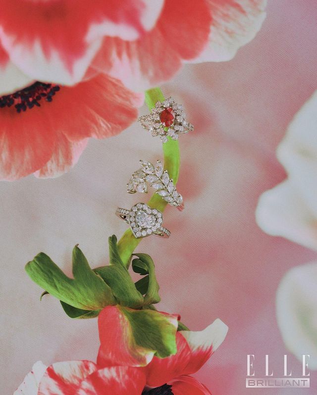 (위부터) 화이트 골드에 루비와 다이아몬드를 세팅한 ‘미모사’ 링은 가격 미정 DAMIANI. 총 3.07캐럿의 마르키즈 컷 다이아몬드를 더한 ‘그린 카펫 컬렉션’ 링은 7천5백만원대 CHOPARD. 플래티넘에 다이아몬드를 세팅한 ‘프리티 우먼 플래티넘 인게이지먼트’ 링은 가격 미정 FRED.