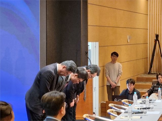 2일 서울 을지로 SKT타워에서 열린 고객 추가 보호 방안 설명회에서 SKT 임원진들이 고개 숙여 사과하고 있다. [사진=주주경제신문 박소연 기자]