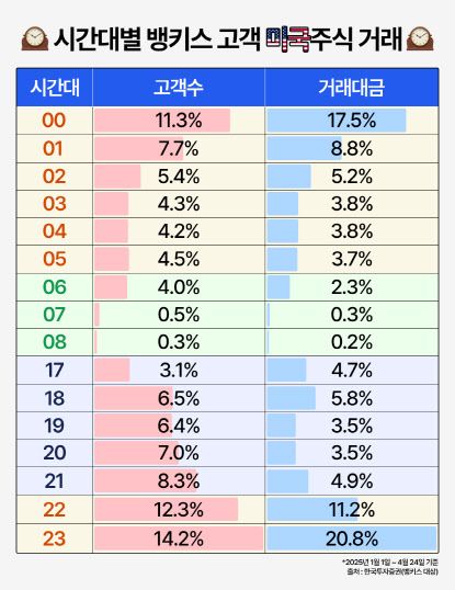 이 가운데 정규장 거래금액 비중이 전체의 74.8%에 달한 것으로 집계됐다. 프리마켓과 애프터마켓을 포함한 시간외 거래 비중(25.2%)을 크게 웃도는 수준이다. 거래 고객수 비중으로도 정규장 거래 고객이 전체의 63.9%를 차지했다. 오후 11시~오전 1시 고객당 거래대금이 가장 높았으며, 반면 오후 8~10시에는 소액 거래가 많았다.